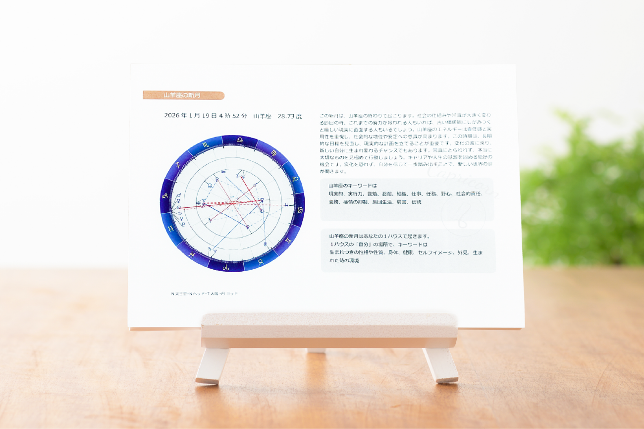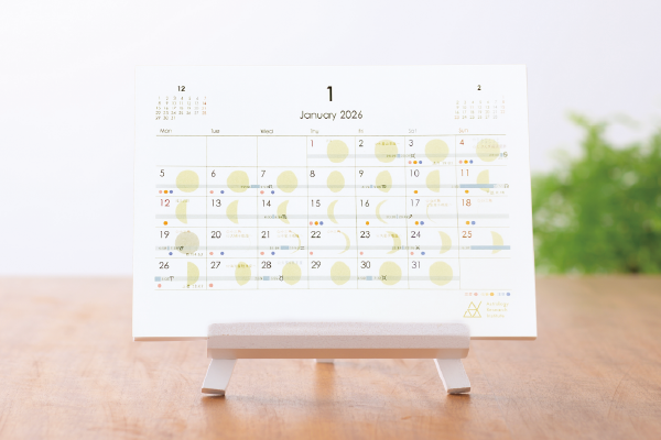 新月カレンダーは、新月のホロスコープ解説に加えて、自分のホロスコープのどの場所で起きて、どういう影響が起きるのか、さらにはその星座のキーワードが記載されていて、とっても便利です。月間カレンダーには、天体の星座移動のタイミングに加えて、重要なアスペクトが出来る日ものっていますし、ハーフサムや天体の運行状況に基づいた恋愛運、仕事運のよい日や注意日も書いてあり、2026年の予定をたてるのになくてはならないカレンダーです。自信をもっておススメします!